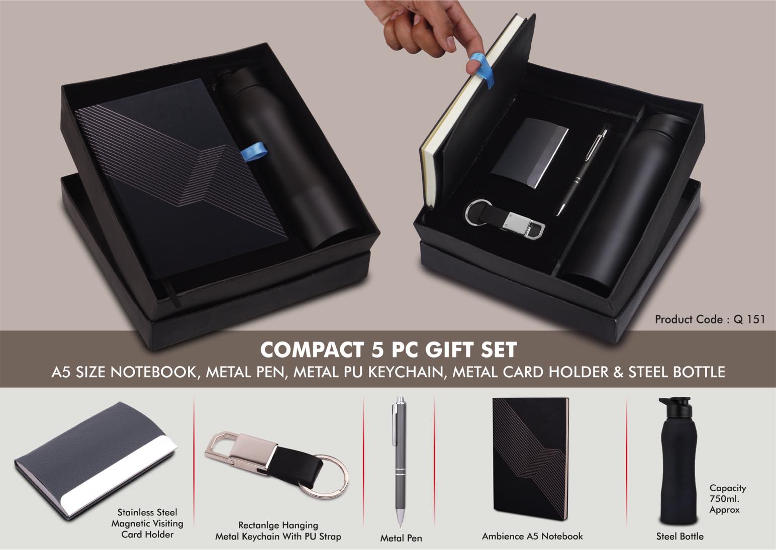 Compact 5 Pc Black Gift Set A5 Size Notebook, Metal Pen, Metal Pu Keychain, Metal Card Holder & Straight Steel Bottle