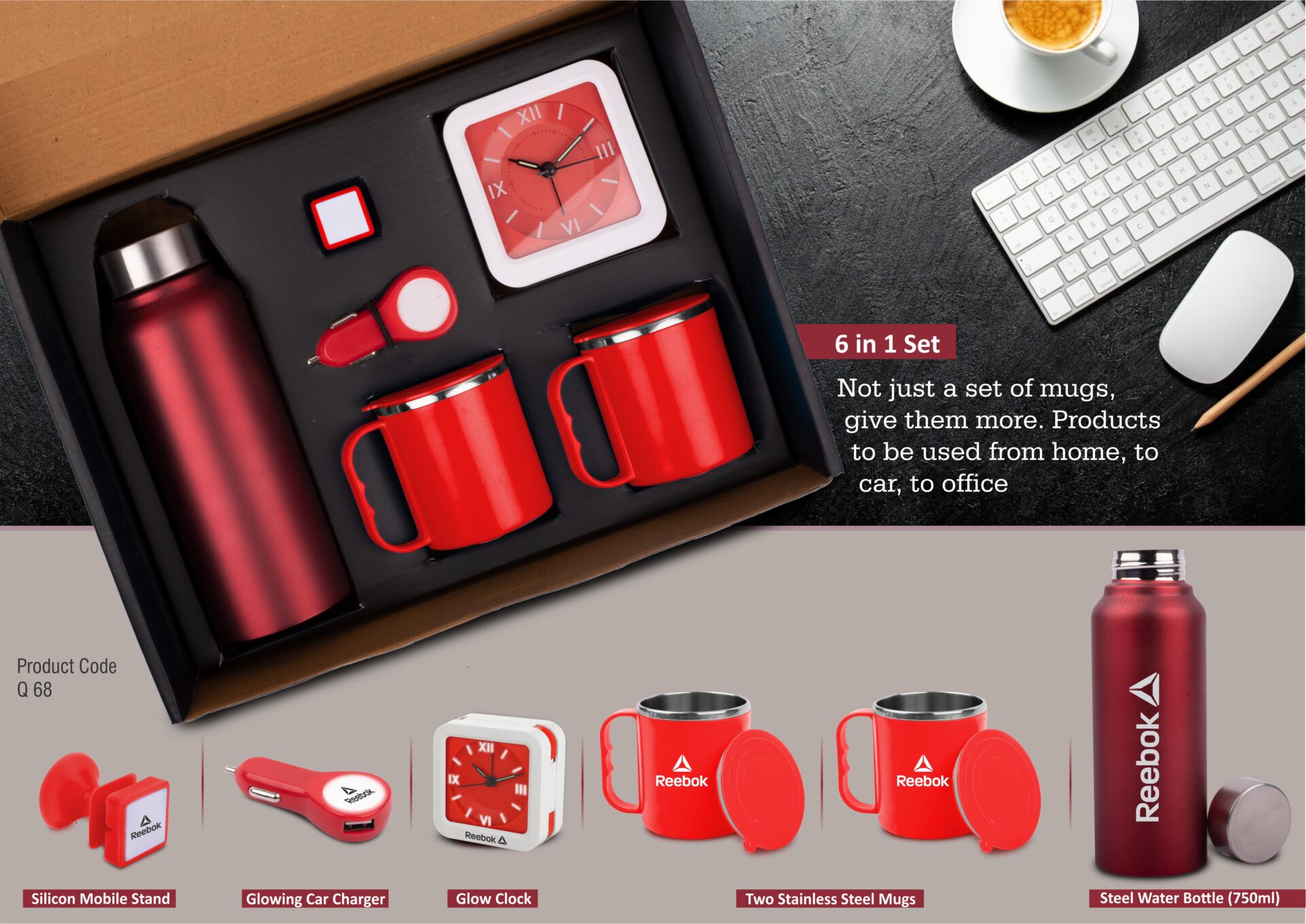 6 In 1 Set Steel Water Bottle (750Ml), Silicon Mobile Stand, Glowing Car Charger, Glow Clock, Two Stainless Steel Mugs