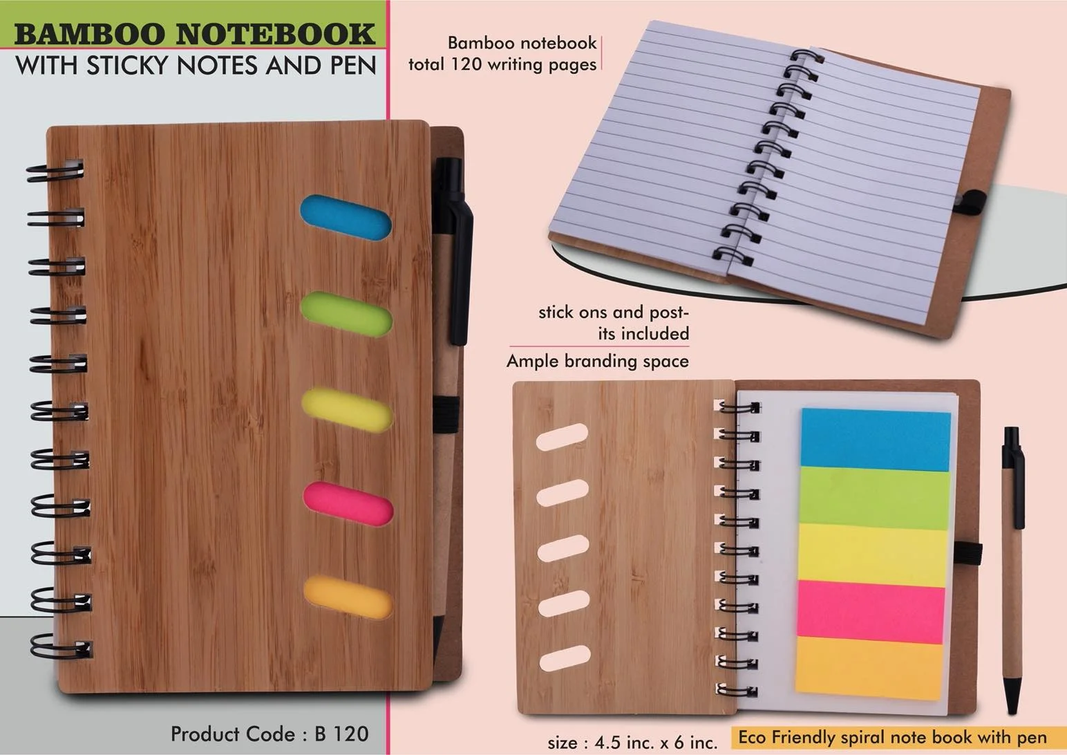 Notebook made of natural bamboo Eco friendly choice Undated pages, so product can be used round the year Contains 120 writing pages and Sticky notes Eco friendly pen included