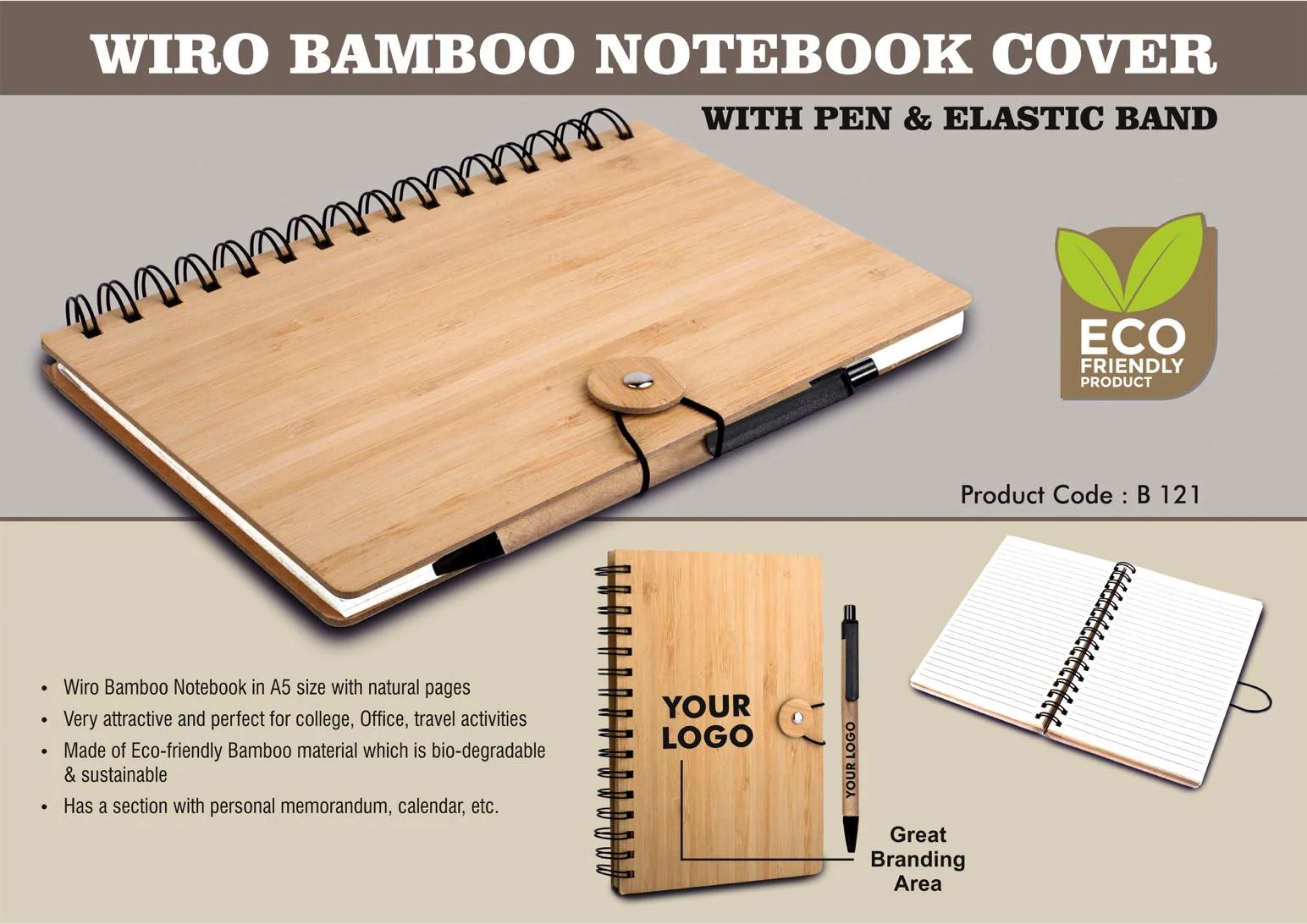 Wiro Bamboo Notebook in A5 size with natural pages Eco friendly choice Undated pages, so product can be used round the year Contains 126 ruled writing pages and 32 drawing pages with dots Contains page to enter personal information with calendar Eco friendly pen included
