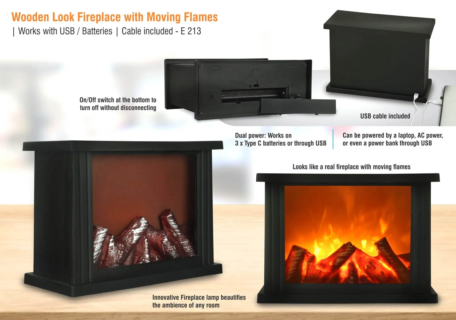 E213 ? Wooden look Fireplace with moving flames | Works with USB / Batteries | Cable included