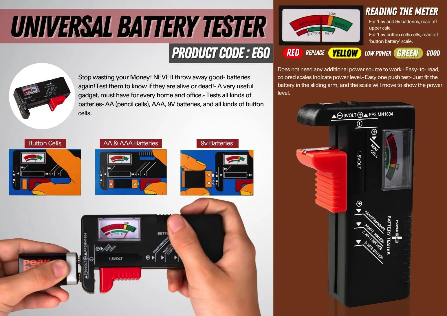 ? Easy one push test, just fit the battery in the sliding arm, and the scale will move to show the power level. For 9V batteries use side panel contacts.