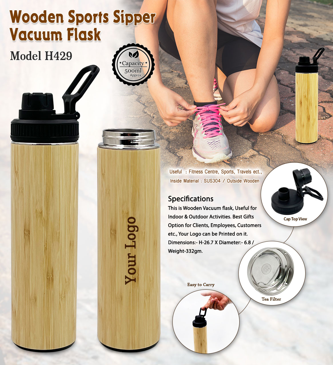 H429 500-PO Wooden Sipper Vacuum Flask