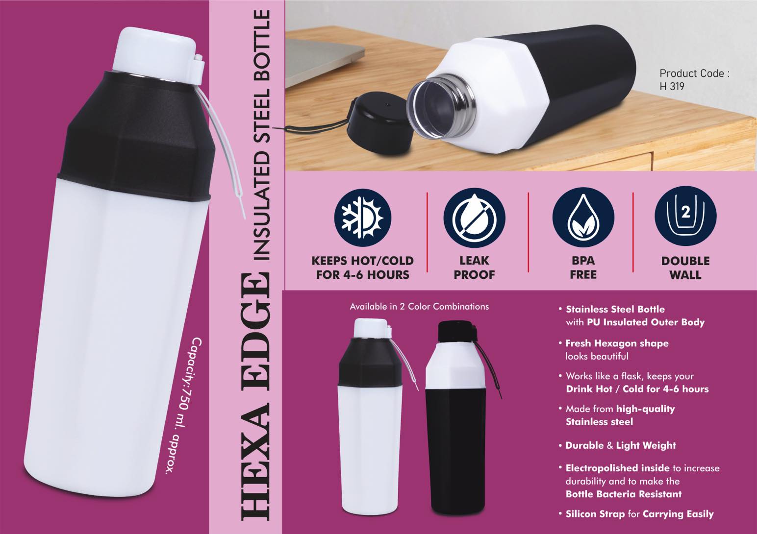 Hexa Edge: Insulated Steel Bottle | Keeps Hot & Cold for 4-6 Hours | Strap for Carrying easily | Capacity 750 ml