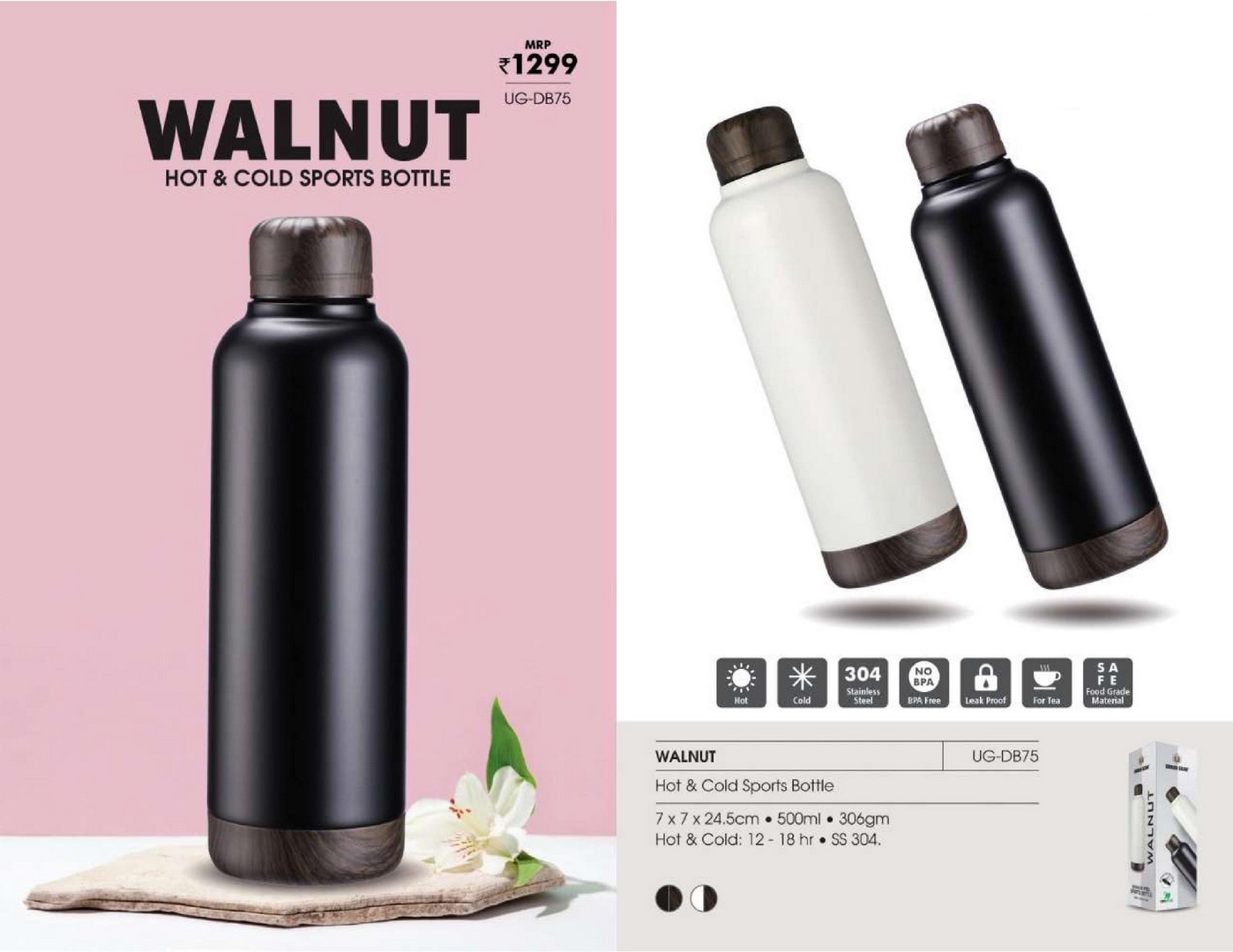 UG-DB75 Walnut Steel Hot n Cold Bottle 500ML